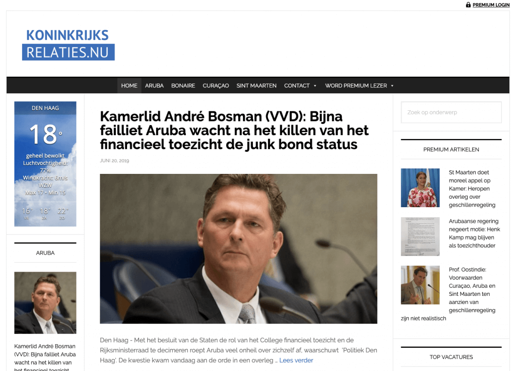 Koninkrijksrelaties.Nu is een online krant en dé nieuwsbron voor iedereen die graag op de hoogte blijft van de invloed van Politiek Den Haag op het Caribisch deel van ons Koninkrijk. Het initiatief werd al in 1987 opgericht met als doel communicatie-advisering. In april 2018 startte Koninkrijksrelaties.Nu met het brengen van nieuwst dat betrekking heeft op het dossier Koninkrijksrelaties (samenwerking van Nederland met de Caribische delen van het Koninkrijk). Als Caribisch Netwerk partner garandeert de online krant journalistieke onafhankelijkheid. Daarnaast is Koninkrijksrelaties.Nu verbonden met andere websites, zoals Aruba.Nu, Bonaire.Nu en Curacao.Nu. Neem gerust eens een kijkje op Koninkrijksrelaties.Nu om verder kennis te maken met deze unieke online krant.