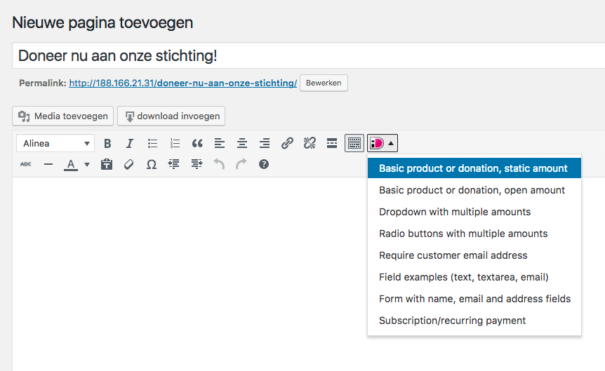 Nu dat je site klaar is voor het ontvangen van betalingen, kun je de donatie knop/knop gaan toevoegen. Je kunt iDEAL knoppen en formulieren toevoegen in berichten en/of pagina’s. In deze handleiding voegen we een donatie knop toe aan een nieuwe pagina “Steun ons!”.