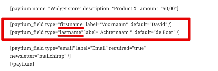 [paytium name="Formulier naam" description="Product naam" amount="50,00"] [paytium_field type="firstname" label="Voornaam" default="David" /] [paytium_field type="lastname" label="Achternaam" default="de Boer" /] [paytium_field type="email" label="Email" required="true" newsletter="mailchimp" /] [/paytium]