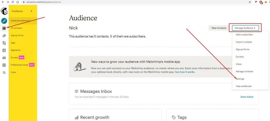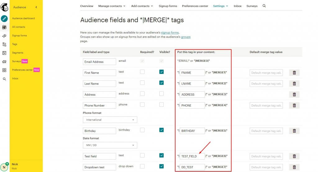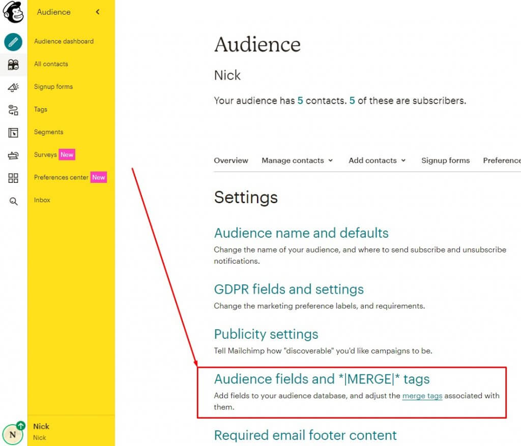 * Vervolgens ga je naar “Audience fields and *|MERGE|* tags”