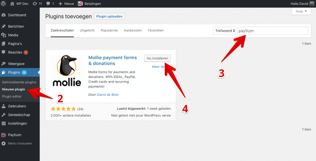 Nadat je het bovenstaande formulier hebt gebruikt of zelf Paytium hebt opgezocht in je WordPress site: