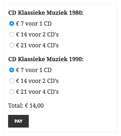 [paytium_field type="radio" label="CD Klassieke Muziek 1990" options="7 voor 1 CD/14 voor 2 CD's/21 voor 4 CD's" options_are_amounts="true" tax="21" /]