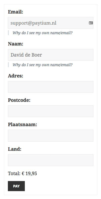 [paytium name="Formulier naam" description="Product naam" amount="19,95" button_label="Pay"]