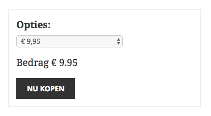 [paytium_field type="dropdown" label="Opties" options="9,95/19,95/29,95" options_are_amounts="true" /]