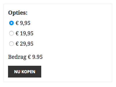 [paytium_field type="radio" label="Opties" options="9,95/19,95/29,95" options_are_amounts="true" /]
