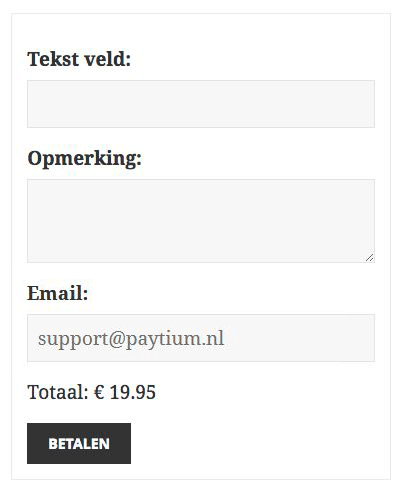 [paytium name="Formulier naam" description="Product naam" amount="19,95"]