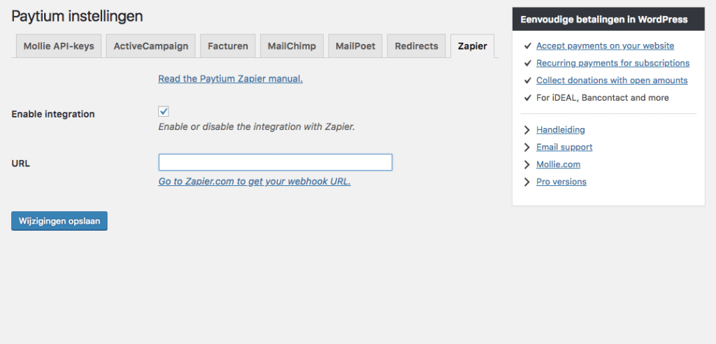 - Ga naar Paytium > Instellingen > Zapier en plak de webhook URL bij Paytium.